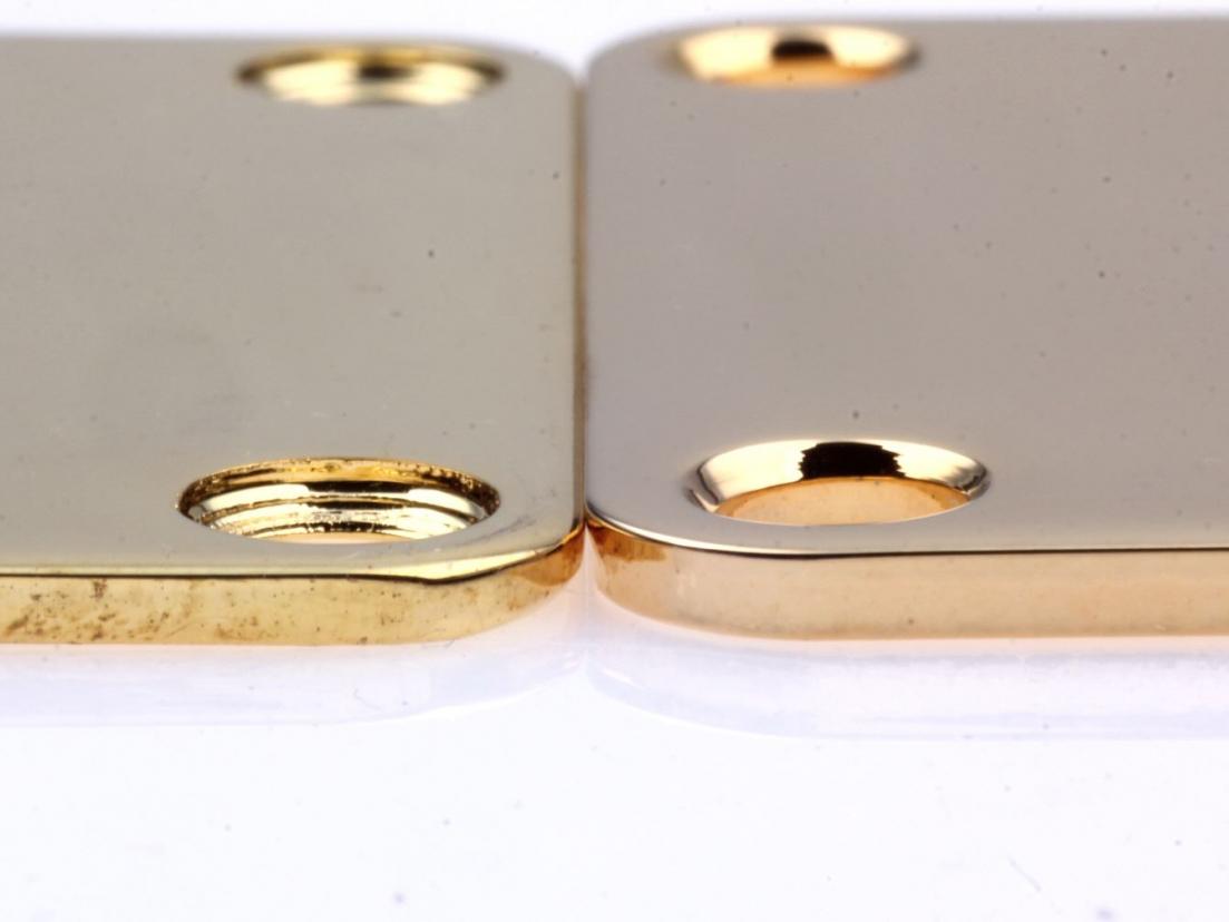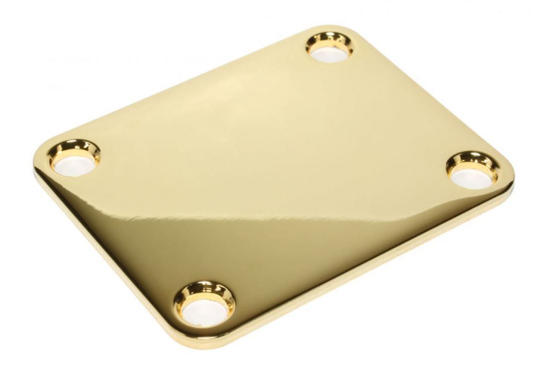 Fat guitar neck plate -Made in USA -Fatter in thickness than a standard neck plate -Goldplated steel -2" x 2.5" (51mm x 64mm) outer dimensions -1.5" x 2"(39 x 51mm) center to center mounting hole dimensions. Holes chamfered(beveled) -.104" thick -2.3 oz weight -Qty 1