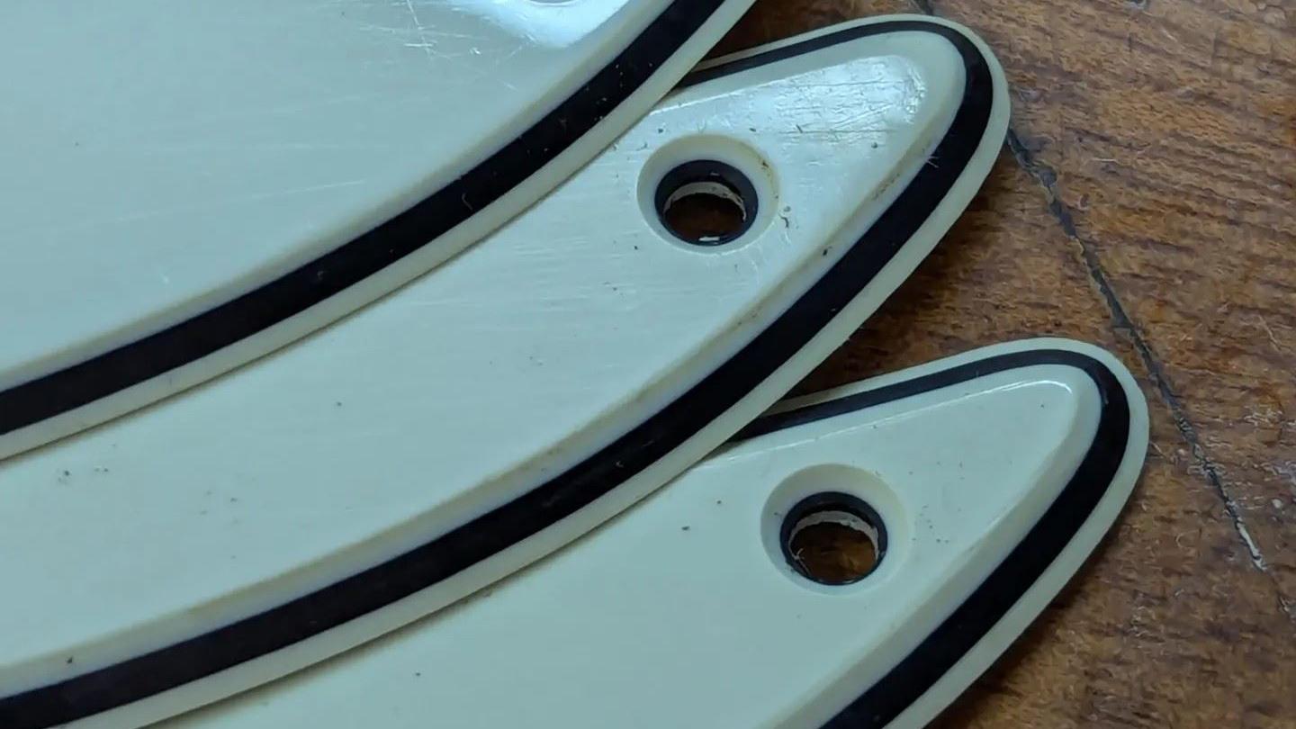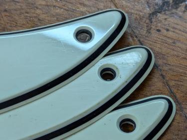 2 Different Greenguards available with following specs: All Guards have thicker black middle layer, 2 different deep hole types for mounting and pickup/switch mounting holes, routermarkings at bevel. Vintage style scoop at neck.