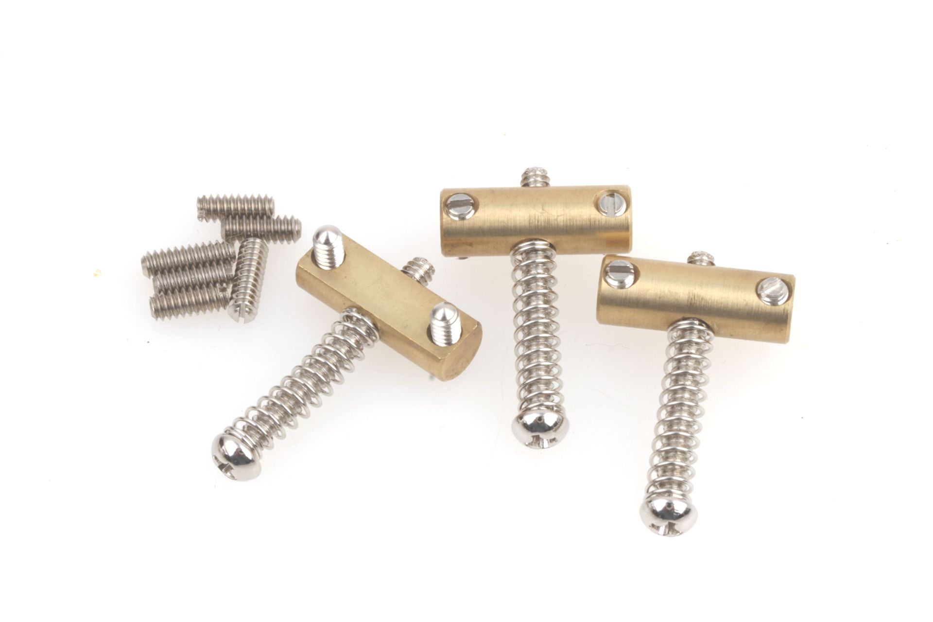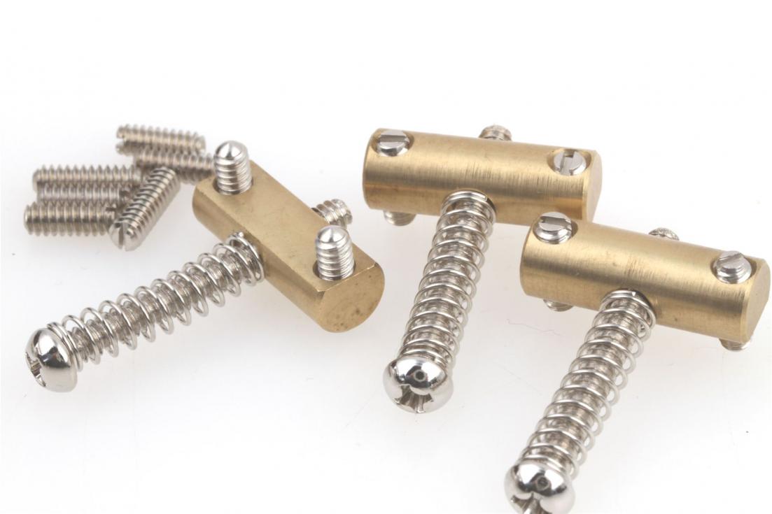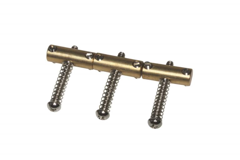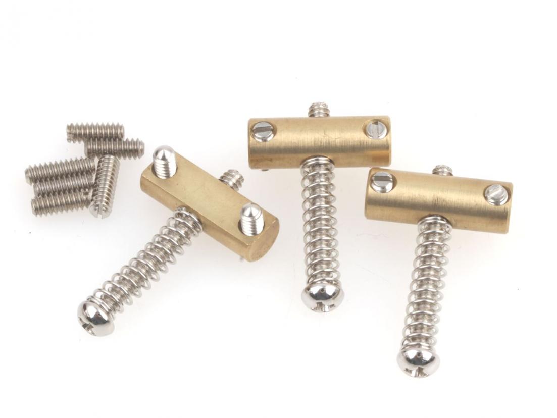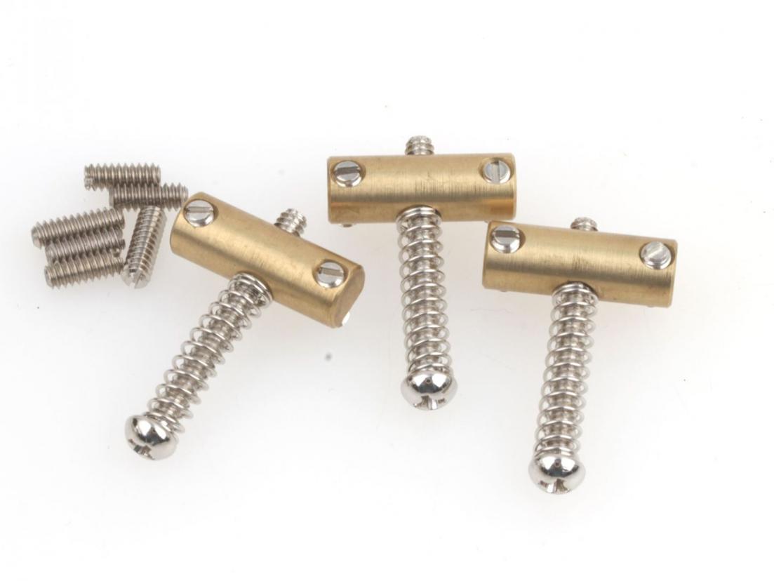 Based on the saddles used on Fender Telecasters and Esquires in the early 50s. Brass barrel saddles with flattened underside to allow very low action. Includes intonation springs, Phillips head intonation screws and slotted saddle height adjustment screws. Set of 3.