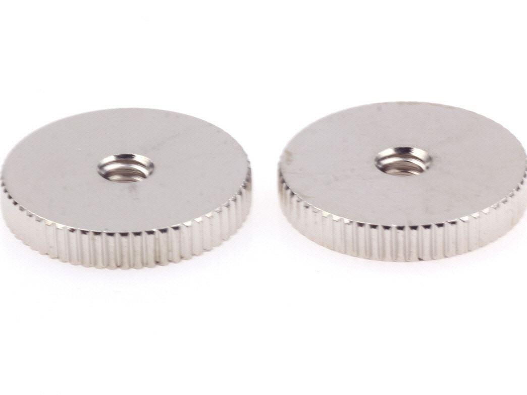 Thumbwheel Gibson Standard Series Brass Nickel plated -Made in the USA -Set of 2 Brass Thumbwheels with fine knurling -Fits USA Gibson guitars equipped with ABR-1 bridge -SAE 6-32 threads -.109" (2.8 mm) thick and .63" (16 mm) diameter