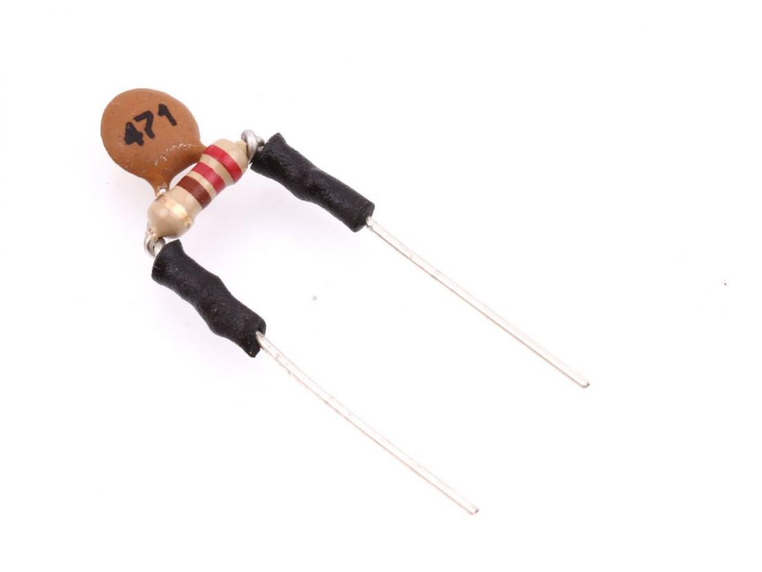 This is simply a 220K resistor in parallel with a 471pf capacitor. We use them on our pre-wired guitar assemblies to preserve high end frequencies and improve the taper when rolling back your volume potentiometer. The volume mods are soldered in parallel between the first and second lugs (2 open lugs) of the volume pot.