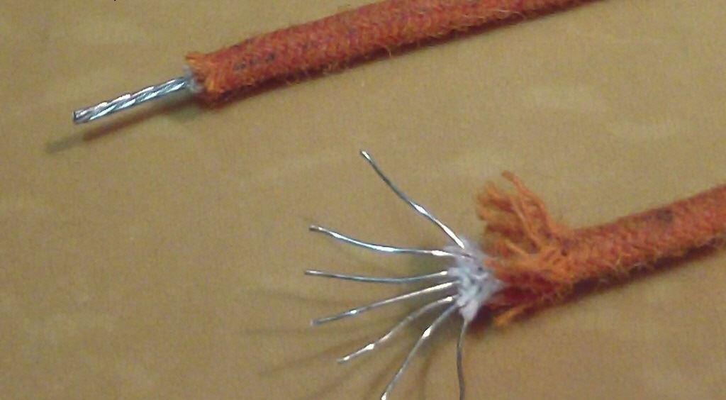 Identical in Appearance and Performance to Original Cloth Wire used in all types of electronics until the 1960s. This cloth wire is specially made for us in the USA, by the original supplier to Leo Fender. It consists of 7 individually tinned and twisted copper strands, with a woven celanese overwrap, followed by a waxed cotton overbraid. Lenght 1 Meter/100cm