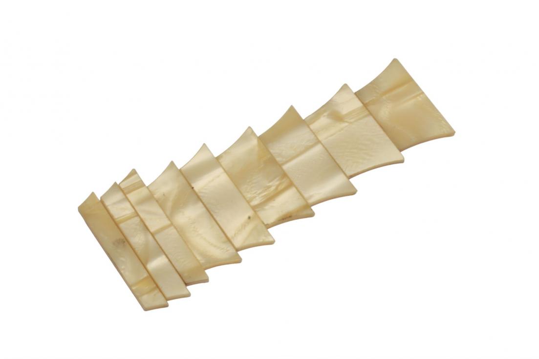 Real cellulose nitrate trapezoid inlays. This celluloid has the same distinctive pattern as seen on most Les Paul's from 1957 thru 1960. The thickness is 0.075" with the pattern running thru the celluloid to allow for installation in Historic Les Paul's with deeper inlay cavity routes. The celluloid can also be sanded down thinner to allow for installation in vintage Les Paul's giving the same vintage look.
