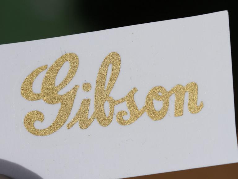 Gibson Prewar Gold Logo. The worlds finest decals...all decals have colorless contour base, so there is no need to cut out! Note all our decals are Printed Silkscreen decals, with Gold or Silver pigments in the highest quality available, not compare to the cheapo Lasercopy decals offered anywhere!