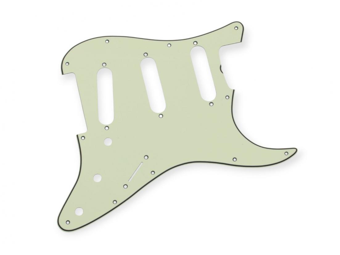 -11 Hole Vintage Mint Green a bit lighter an closer to our Celluloid pickguards for Strat, 3 Ply.- Scoop- Made in Japan, this guard is the U.S. 62 template and will fit US/Mexican Vintage reissue Series.