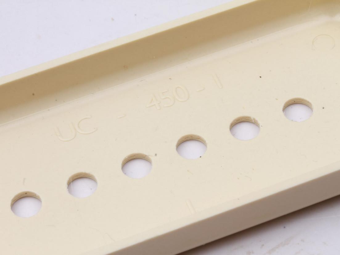 New and aged...real Bakelite guard punched from raw plates with the typical rough cut markings (not CNC machined), correct thickness, early style with rounded bevel and later style, Fender 50's style Bridgeplates with Serial numbers. Vintage correct Controlplates...btw. the ageing of the Blackguards is worldclass and hard to beat!