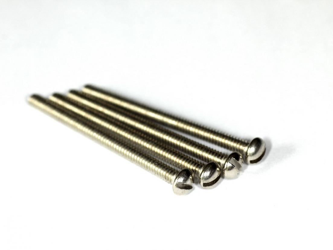 Slotted (Inch thread) humbucker Screw Set (4), Nickel -3-48 X 1 1/4 in. SLOT RH MACHINE SCREW NICKEL - these screws are used to regulate the height of US thread humbucking pickups. They will not fit metric thread pickups. Uses a slotted head like original vintage pickups.