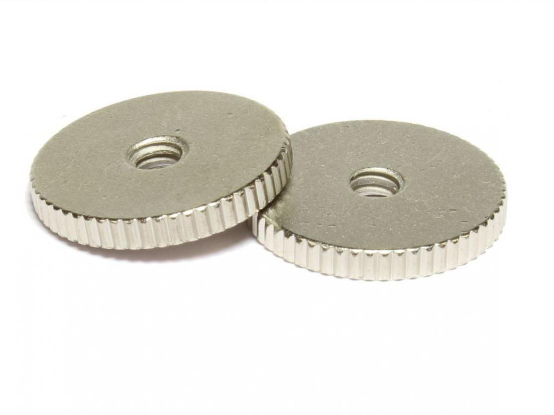 Vintage Thin ABR-1 Bridge Thumbwheels Satin Nickel -Set of 2 Steel Vintage Thin Thumbwheels Made in the USA -Satin Nickel finish for an aged look -Fits USA Gibson guitars equipped with ABR-1 bridge -SAE 6-32 threads -.081" (2.06 mm) thick and .63" (16 mm) diameter